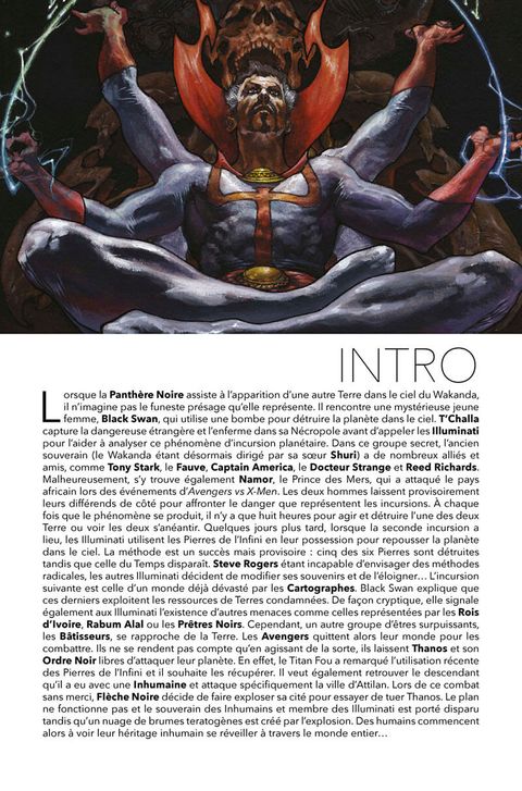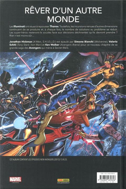 Les Illuminati ont réussi à repousser Thanos, mais les incursions d'ennemis venus d'autres dimensions continuent, amenuisant le nombre de solutions pour les repousser. Le groupe de super-héros réussira-t-il à rester soudé face aux décisions déchirantes qu'il va devoir prendre ? Rien n'est moins sûr... Jonathan Hickman (X-Men, S. H. I. E. L. D.) est épaulé par Simone Bianchi (Wolverine), Valerio Schiti (Tony Stark : Iron Man) et Kev Walker (Avengers Arena) pour ce nouveau chapitre de sa grande saga Avengers conduisant à Secret Wars. Contient les épisodes US New Avengers (2013) #13-23.