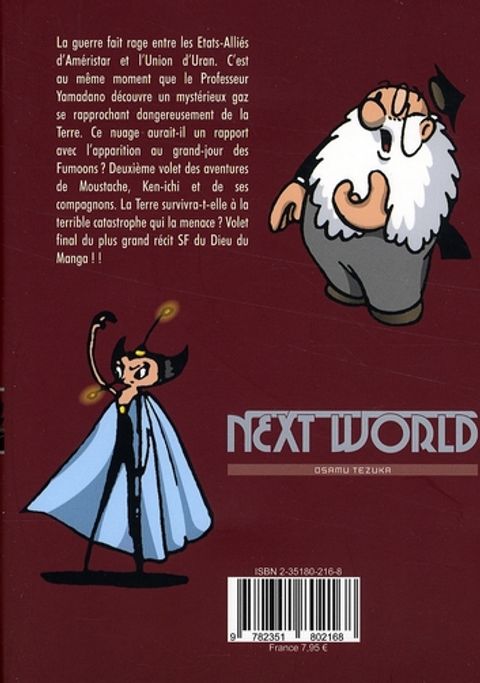 La guerre fait rage entre les Etats-Alliés d'Améristar et l'Union d'Uran. C'est au même moment que le Professeur Yamadano découvre un mystérieux gaz se rapprochant dangereusement de la Terre. Ce nuage aurait-il un rapport avec l'apparition au grand-jour des Fumoons ? Deuxième et dernier volet des aventures de Moustache, Ken-ichi et de ses compagnons. La Terre survivra-t-elle à la terrible catastrophe qui la menace ? Oeuvre de jeunesse de TEZUKA, premier tome du dernier volet de la trilogie de Tezuka, dans l'ordre Lost World, Metropolis et Next World. Tezuka évoque des thèmes tels que la destruction de l'humanité ou la bêtise, mais il dépeint en même temps un amour pour les humains et toutes les créatures vivantes. Travail unique, car plus de vingt personnages dans cette histoire jouent un rôle important. Cette trilogie, dont les manuscrits ont été écrits à l'époque de la dernière guerre (39/45) est l'une des oeuvres majeures de TEZUKA.
