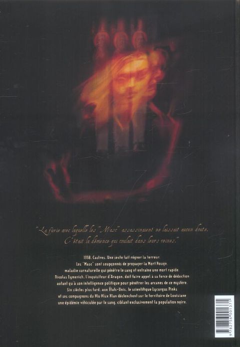 1358. Nicolas Eymerich se rend à Castre afin d'y mener une enquête sur les "mascs". Ces adeptes d'un culte hérétique sont suspectés d'être à l'origine de "la mort rouge", une maladie du sang inconnue. Atlanta, 1952. Stetson Kennedy, agent infiltré dans le Klan, découvre la personnalité froide et déterminée de Lycurgus Pinks, biologiste spécialisé dans l'étude des maladies congénitales des populations noires...