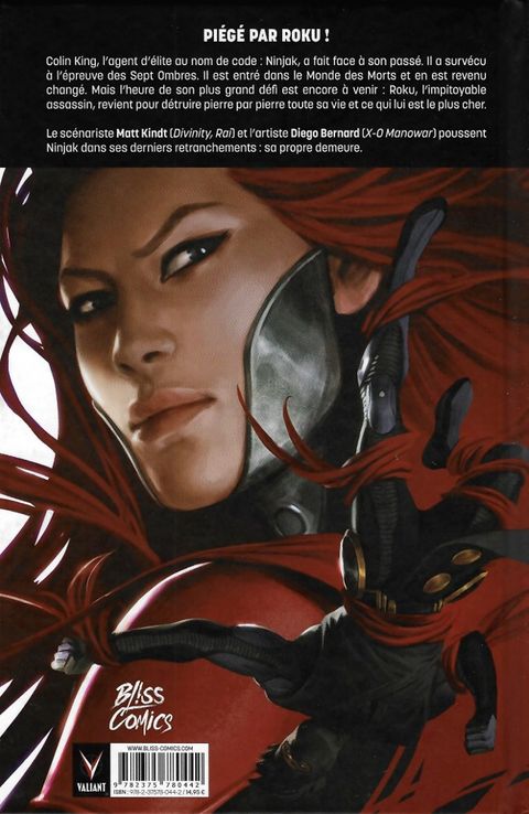 Le dernier combat de colin king ! Colin King, l'agent d'élite au nom de code : Ninjak, a fait face à son passé. Il a survécu à l'épreuve des Sept Ombres. Il est entré dans le Monde des Morts et en est revenu changé. Mais l'heure de son plus grand défi est venue : Roku, l'impitoyable assassin, revient pour détruire sa vie et tout ce qui lui est cher. Ce nouveau chapitre de la saga est toujours scénarisé par Matt Kindt (Divinity, Rai) et dessiné cette fois par Diego Bernard (X-O Manowar). Contient Ninjak #14-17.