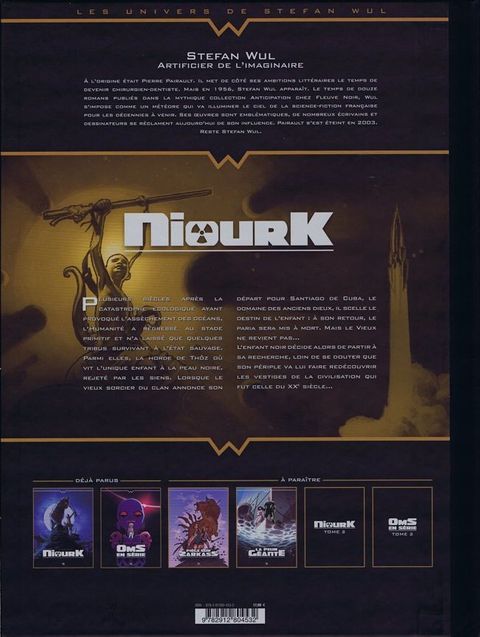 Sur une Terre post-apocalyptique où l'Humanité a régressé au stade primitif après une catastrophe nucléaire ayant asséché les océans et donné naissance à des chimères mutantes, quelques tribus survivent à l'état sauvage. Parmi elles, la horde de Thoz, où vit l'enfant noir, rejeté par les siens. Lorsque le vieux sorcier de la tribu le condamne à mort, l'enfant noir se met en marche pour Niourk, la ville des dieux, où ne subsistent que ruines et étranges mécanismes, vestiges de la civilisation du XXe siècle. Poulpes mutants, mégalopole fantôme et androïdes vénusiens : redécouvrez le plus grand succès de l'auteur culte Stefan Wul, un classique de la science-fiction remis à neuf par un maître du genre : Olivier Vatine.