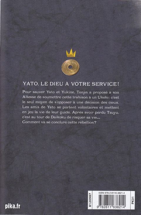 Pour sauver Yato et Yukine, Tenjin a proposé à son Altesse de soumettre cette trahison à un Ukehi : c'est le seul moyen de s'opposer à une décision des cieux. Les amis de Yato se portent volontaires et mettent en jeu la vie de leur guide. Après avoir perdu Tsuyu, c'est au tour de Daikoku de risquer sa vie... Comment va se conclure cette rébellion ?