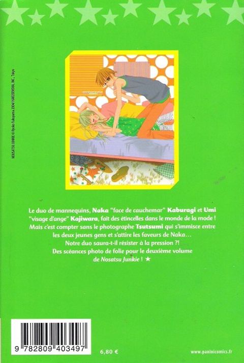 Le duo de mannequins, naka ""face de cauchemar"" kaburagi et umi ""visage d'ange"" kajiwara, fait des étincelles dans le monde de la mode ! mais c'est compter sans le photographe tsutsumi qui s'immisce entre les deux jeunes gens et s'attire les faveurs de naka... Notre duo saura-t-il résister à la pression ? ! des séances photo de folie pour le deuxième volume de nosatsu junkie !