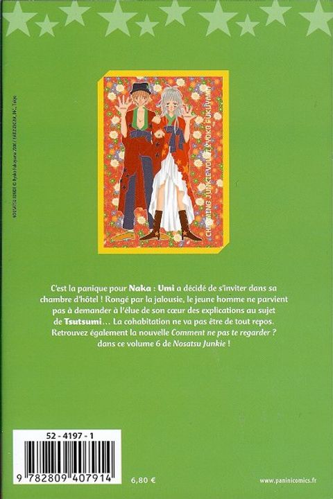 C'est la panique pour Naka : Umi a décidé de s'inviter dans sa chambre d'hôtel ! Rongé par la jalousie, le jeune homme ne parvient pas à demander à l'élue de son coeur des explications au sujet de Tsutsumi. La cohabitation ne va pas être de tout repos. Retrouvez également la nouvelle "" Comment ne pas te regarder ? "" dans ce volume 6 de "" Nosatsu Junkie ! "".
