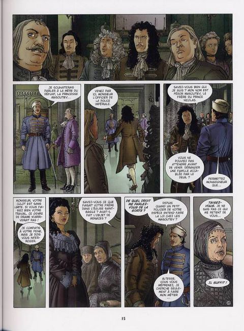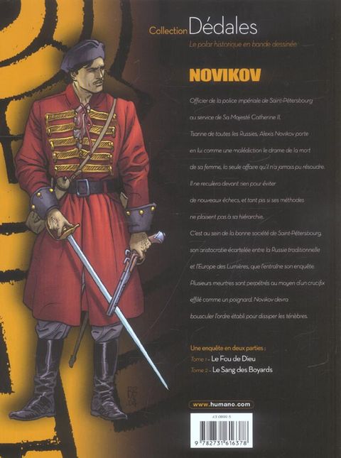 Massacres au Crucifix... Officier de la police impériale, Alexis Novikov résout des énigmes criminelles dans un Saint-Petersbourg tiraillé entre la Russie éternelle des anciens tsars et celle européenne, moderne et éclairée, voulue par Pierre le Grand. Pour parvenir à ses fins, il n'hésite pas à employer des moyens qui ne sont pas toujours très... « orthodoxes » ! Première enquête : Un illuminé nommé Troubelkine s'en prend à la bonne société de Saint-Pétersbourg qu'il accuse de corruption, de libertinage et de décadence. Il devient le suspect idéal dès lors que plusieurs membres de l'aristocratie sont sauvagement assassinés, un crucifix planté dans le coeur. Et pourtant, ces mêmes aristocrates semblent protéger celui qu'on appelle le « starets », le fou de Dieu... Une enquête semée d'embûches pour le fringant Novikov, qui n'est pas le dernier à détester cette classe de nantis qu'il tient pour responsable de la mort de sa femme...