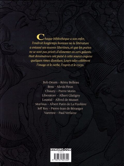 Dans une magnifique anthologie, Gilles Durieux réunit experts du vers licencieux et dessinateurs de renom. Les dessins rêveurs de Beb Deum illustrent les mots érotiques de Belleau tandis que la paillardise de Pierre Motin rencontre le trait franc et sans détour de Chauzy. Moebius emballe rimes et assonances de Patin de la Fizelière dans une bande dessinée psychédélique digne de ses plus grandes oeuvres. En tout huit associations originales pour le plus grand plaisir de nos sens.