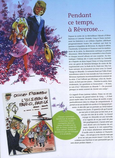 Le mot rêveur est injustement bafoué par les gens trop raisonnables qui, souvent, rendent le monde ennuyeux. Pourtant le rêve possède ses lettres de noblesse : Rêverose, le pays où tout est possible. C'est là que vivent Olivier, Colombe, Monsieur Pertinent et leurs compagnons hors du commun.
