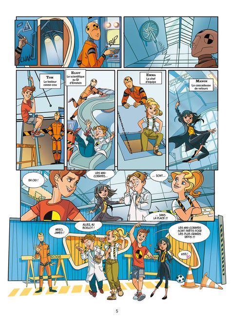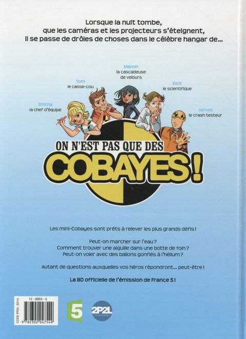 Avec l'aide de James, le crash testeur, Emma (la chef d'équipe), Eliot (le scientifique), Tom (le casse-cou) et Manon (la cascadeuse de velours) investissent le hangar ! Les mini-cobayes sont prêts pour les plus grands défis ! Peut-on marcher sur l'eau ? Comment trouver une aiguille dans une botte de foin ? Peut-on voler avec des ballons gonflés à l'hélium ? Autant de questions auxquelles nos héros répondront. peut-être !