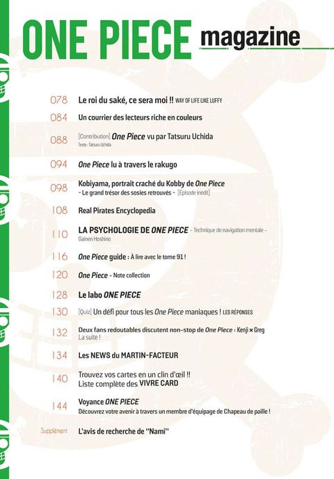Les reportages autour de One Piece se poursuivent, pour le plus grand plaisir des fans. Dans cette une revue entièrement consacrée à la série, découvrez l'importance du rakugo dans le pays des wa, une poupée Chopper à monter soi-même, la suite du roman sur l'histoire de Trafalgar Law, sans oublier les interviews, visuels inédits et poster… Des contenus exclusifs pour vous plonger dans l'univers inventé par Eiichiro Oda. À ne manquer sous aucun prétexte !
