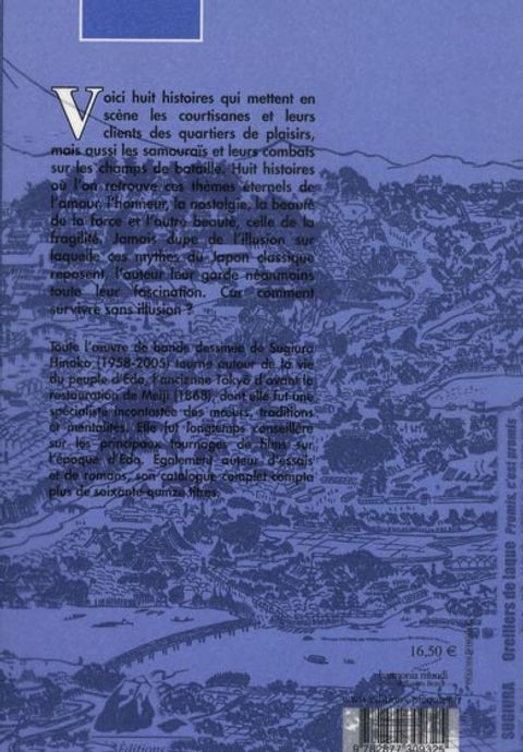 voici huit histoires qui mettent en scène les courtisanes et leurs clients des quartiers de plaisirs, mais aussi les samouraïs et leurs combats sur les champs de bataille. huit histoires oú l'on retrouve ces thèmes éternels de l'amour, l'honneur, la nostalgie, la beauté de la force et l'autre beauté, celle de la fragilité. jamais dupe de l'illusion sur laquelle ces mythes du japon classique reposent, l'auteur leur garde néanmoins toute leur fascination. car comment survivre sans illusion ?.