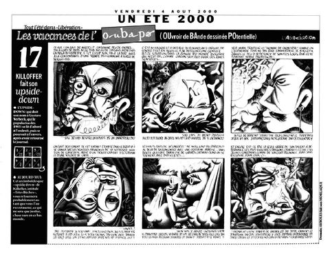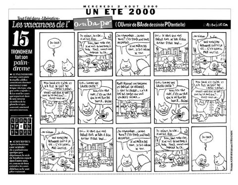 C'est à l'Ouvroir de Bandes Dessinées Potentielles que le journal Libération s'est adressé cet été pour divertir ses vacanciers de lecteurs. Durant six semaines, les éminents ouBaPiens Ayroles, Gerner, Killoffer, Lécroart, Menu et Trondheim se sont attelés à une tâche un peu contraignante, à coups de pliages, d'itérations, de palindromes, de strips croisés, d'upside-down et de morlaques. Six exercices qu'ils ont chacun à leur manière menés d'une main de maître. Cet OuPus 3 qui paraît avant l'OuPus 2 prévu courant 2001, réunit l'intégralité de ces travaux. Un cahier détachable de 12 pages est encarté pour permettre au lecteur d'effectuer les exercices de pliage sans abîmer l'ouvrage.