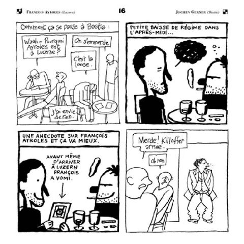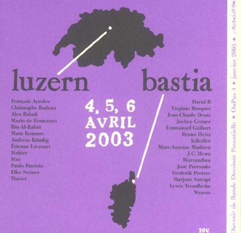 Ce quatrième oupus de l'ouvroir de bande dessinée potentielle présente le résultat d'une unique performance collective, ayant donné lieu à 392 cases, essentiellement réalisées en trois jours, par 28 auteurs. Cet exercice a eu lieu du 4 au 6 avril 2003, durant les festivals de bande dessinée de bastia (corse) et luzern (suisse alémanique). il est né du constat répété que ces deux festivals, parmi les meilleurs d'europe, ont malheureusement lieu chaque année le même week-end. a l'initiative de mirjam broger, du festival fumetto de lucerne, il fut décidé d'imaginer un événement expérimental faisant intervenir, au même moment et dans un même projet, des auteurs présents à lucerne et à bastia. Il fut confié à l'oubapo le soin de trouver les modalités de cette performance en deux lieux simultanés. le cahier des charges impliquait la présence d'une équipe oubapienne dans chacun des deux lieux pour superviser les opérations, la participation d'autres auteurs invités aux deux festivals ; la transmission vis internet de l'oeuvre collective en train de se faire d'un lieu à l'autre, ainsi que la présentation in vivo de l'exercice au public.