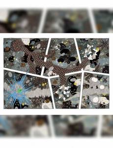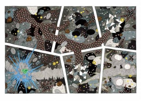 Dans la mythologie grecque, Ouranos ( Οὐρανός: « celui qui fait pleuvoir ») est une divinité primordiale personnifiant le Ciel et l’Esprit démiurgique. Ce livre fait suite à Gaia, premier livre (et grand succès) de Thierry Cheyrol, paru en 2017 à La 5e Couche. Gaia (la Terre) est l’épouse d’Ouranos. Tel le Dieu de la Genèse séparant le firmament de la terre, Cheyrol se tourne (naturellement) vers les astres, après avoir exploré les entrailles fécondes de notre planète. Ainsi découvre-t-on une continuité, un isomorphisme, une «isoplastie», du bas et du haut (si tant est que ces mots aient encore du sens), du micro au macro. Il est un mot galvaudé, dès qu’il s’agit d’aborder l’œuvre d’un auteur, qu’il faudra bien employer ici: Cheyrol nous délivre un Univers. Des astres imaginaires et d’improbables aérolithes filent au long des pages, comme autant de motifs graphiques qui n’ont d’abstraits que l’apparence. Le dessinateur décrit des invasions, des connexions, des fusions, des propagations, des conflagrations et des conquêtes, dans un bouillonnement dont on ne sait s’il est cataclysmique ou créateur, à moins que ce ne soit la même chose. L’atome primitif en expansion suivra ses propres lois, celles de la thermodynamique, celles de la relativité, celles de la théorie des quantas, toutes incompatibles, suivant les règles contradictoires de la dissipation et de l’entropie, parvenant fatalement à leur Dessein fractal. On y croise Hypérion, un Titan que l’on assimile au Soleil, qui a aussi donné son nom à une lune de Saturne. La matière et les objets célestes envahissent les planches, glissent entre les cases (ou par-dessus), à travers le livre et débordent même du champ du livre. Cheyrol, démiurge ou simple témoin du processus créateur (le sien, pourtant), renouvelle les agencements de la page, recombine en permanence ses formes organiques et cosmiques. Comme pour Gaia, Cheyrol a minutieusement programmé son récit. Les deux livres comptent tout deux 121 planches et sont d’emblée envisagés sur cette durée précise. L'avant-propos est signé Fernand Fernandez.
