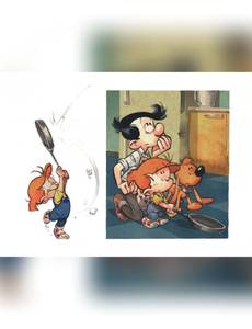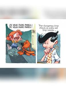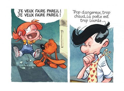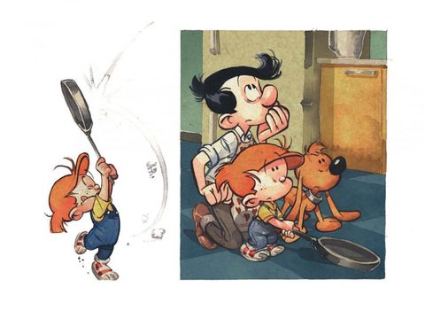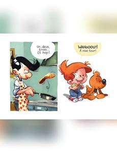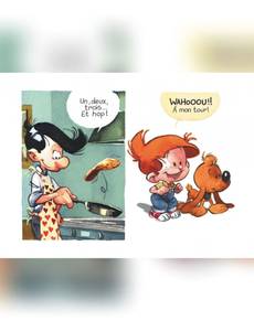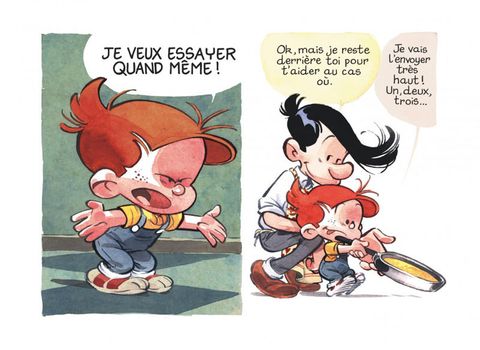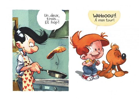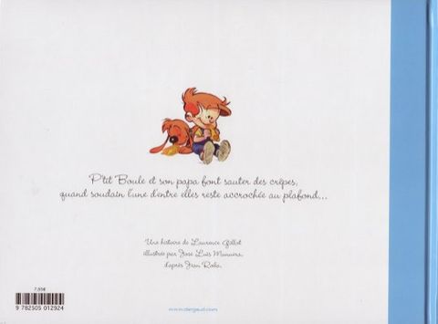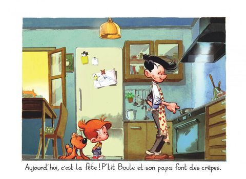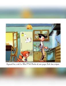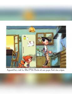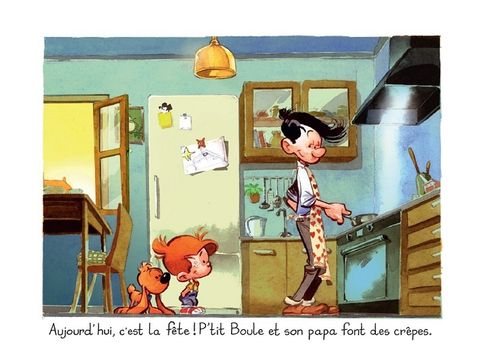 P'tit Boule et son papa font des crêpes. P'tit Boule veut faire sauter sa crêpe tout seul. Elle se retrouve collée au lustre de la cuisine. Bill le cocker super gourmand saute en l'air, il aimerait tellement la manger ! Cette partie de crêpes bascule en un vrai moment de rigolade familial.