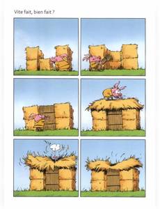 Les trois petits cochons se construisent une maison, une de paille, une de bois et une troisième de brique que le loup tente de détruire... Raconté dans une BD sans texte, le conte est suivi de sa version texte et d'un atelier pour apprendre à dessiner les personnages.