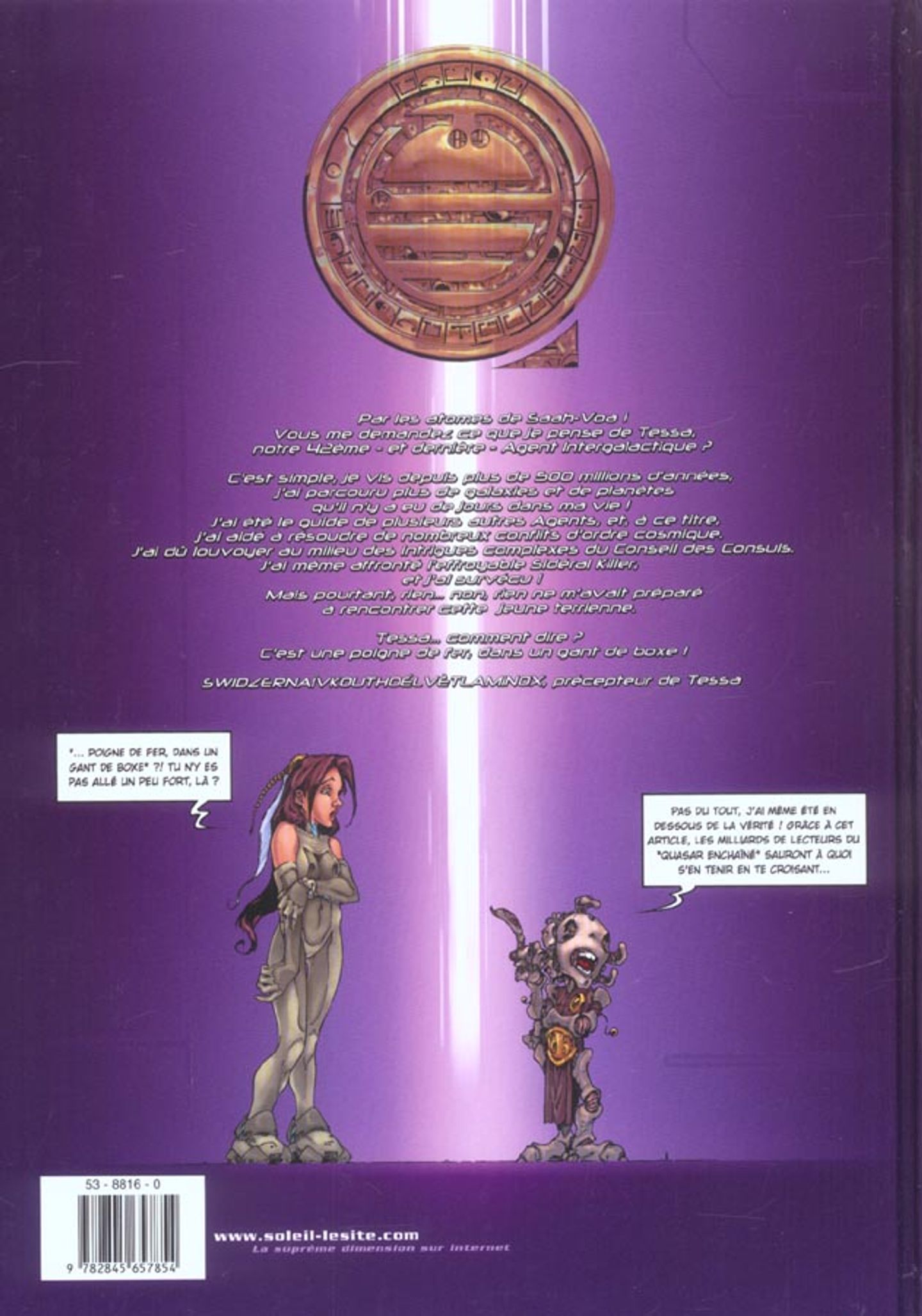 Subtil alliage de science-fiction, d’humour et d’action, vous ne tarderez pas à succomber au charme, au dynamisme et au charisme de tessa agent intergalactique ! Tessa est une pétillante lycéenne de 16 ans, partagée entre sa famille, ses amis, ses études, et les compétitions de gymnastique où elle excelle... Seulement voilà, une nuit alors qu'elle vient de s'endormir, une entité extra-terrestre se matérialise au beau milieu de sa chambre ! Bien malgré elle, Tessa se retrouve alors téléportée à des millions d’années lumières de la terre... Sa présence est requise par les plus hautes instances de l'univers, afin d'y subir l’ultime l’épreuve de sélection qui va faire d'elle la 42ème et dernière Agent Intergalactique...
