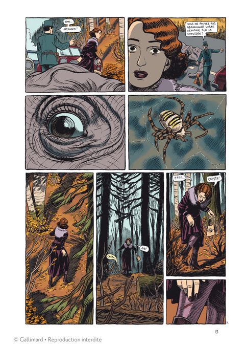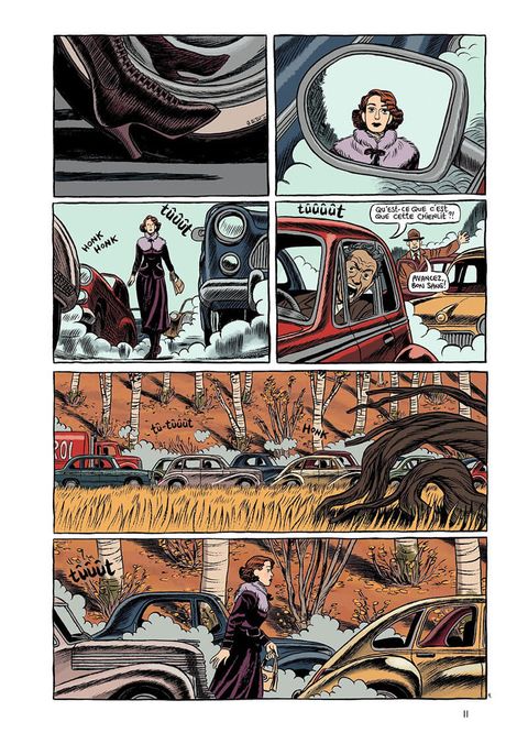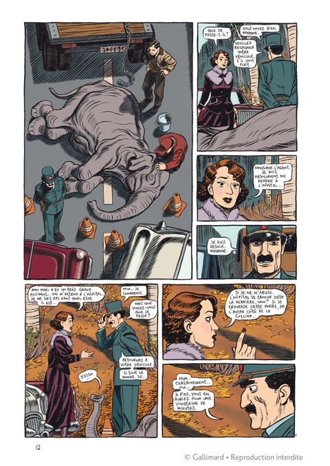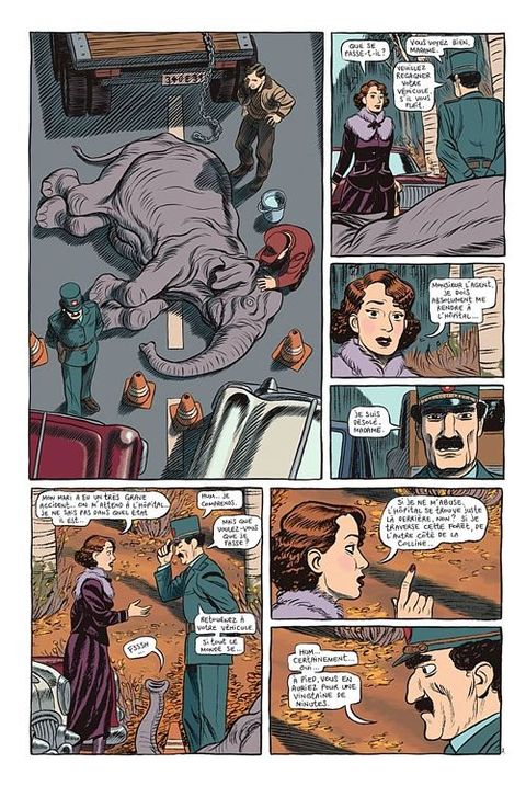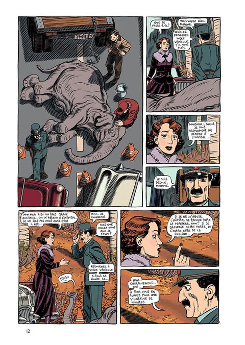 Il suffit de quelques cases, à peine deux ou trois pages. D’une file de voitures bloquées par un pachyderme étendu en travers de l’asphalte, d’une femme, élégante, qui marche au milieu de la route. Un peu affolée, agitée, elle cherche son mari soi-disant accidenté et nous entraine dans son sillage. (...) Voir le commentaire