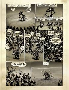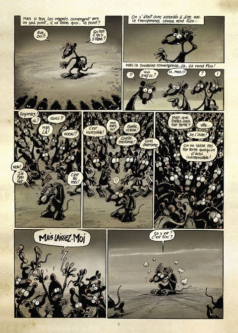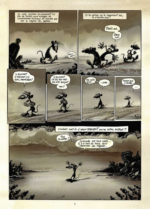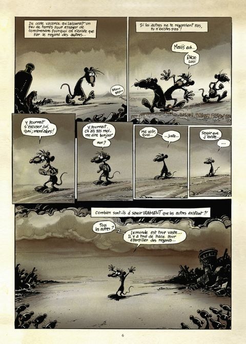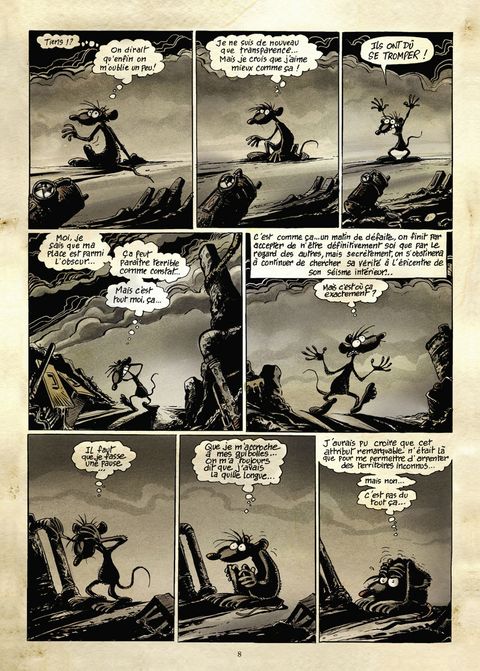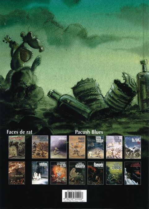 « Tu vois man, la vie est une agitation globale terriblement complexe et il n'y a que la proximité de la mort qui peut t'en apporter la révélation ». La proximité de la mort, ou peut-être la lecture de Pacush Blues ? En marge du monde des humains, dans la crasse et les ordures, vivent les rats de Pacush Blues. Après s'être attaqué à l'intolérance, l'égoïsme, la manipulation, la xénophobie et tous ces petits bonheurs de la vie en société, dans ce nouveau tome Ptiluc amène ses rats à plonger dans les méandres d'une réflexion philosophie sur l'essence de la vie, et les réactions et désirs paradoxaux que cela entraîne ! Paradoxe de l'envie de solitude et du besoin des autres, de la binarité entre la lumière éblouissante et de l'obscurité enveloppante, du désir de vivre en pleine conscience et de la tentation de se laisser glisser sur l'existence sans même savoir le jour qu'il est... Et puis la mort, la maladie, la vieillesse; est-ce une malédiction, un aboutissement ou un passage ? Notre héros déglingué est taraudé par ces questions existentielles depuis qu'il a pris l'habitude de discuter avec l'âme chevillée au corps en décomposition d'un de ses congénères. À la manière des cobayes de laboratoire, observez dans quelles turpitudes vivent, survivent et meurent les rats de Ptiluc, vous en apprendrez sans aucun doute beaucoup sur vous-même ! Dans un univers sombre forcément propice à l'humour noir, dans des pages somptueuses où l'abstraction côtoie la déconnade, cet auteur majeur nous tend un miroir déconcertant sur notre humanité. Heureusement que Kant et Sartre n'avaient pas pensé à faire de la BD avant lui ! Enfin, Claude Serre ne disait-il pas de l'oeuvre de Ptiluc : « C'est beau ! C'est simple, on dirait du Proust ! Mais en mieux dessiné... » ?