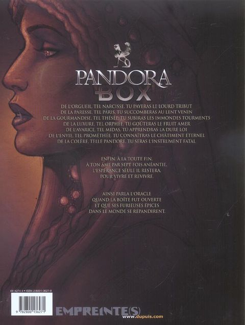 Orgueil, clonage et mythe de Narcisse : le tiercé gagnant pour inaugurer "Pandora Box" Aux états-Unis, la campagne présidentielle bat son plein. Les élections ont lieu dans cinq jours. Le président en place, Narcisse Shimmer, est candidat à sa propre succession. Il s'agit d'un homme orgueilleux mais sa politique porte ses fruits et il trône en tête des sondages. En désespoir de cause, ses adversaires politiques ont recours aux services de Ron Grubb, un détective privé. Sa mission est simple. Il doit faire chuter Shimmer en levant le voile sur un scandale. N'importe lequel, pourvu que le président soit déconsidéré.Grubb se met en chasse. Il ne dispose que de cinq jours. C'est peu. Mais pour un "fouille-merde" de sa trempe, c'est suffisant... Pandora box : huit albums, un scénariste, sept dessinateurs. Les sept premiers albums de la série portent le titre d'un péché capital et l'associent à une technologie moderne et à un mythe grec. Les sept péchés capitaux sont les équivalents judéo-chrétiens des maux de la boîte de Pandore. L'espérance, qui selon la légende en sortit en dernier lieu, donne son titre au huitième et dernier album.