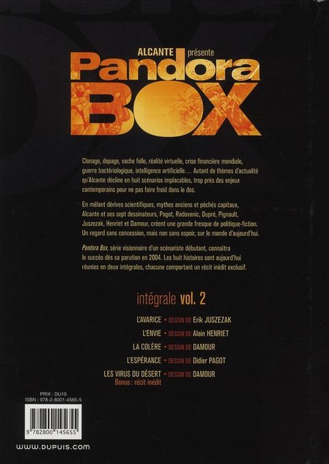 La série à succès "Pandora Box" enfin en Intégrale ! Vache folle, armes bactériologiques, spéculation boursière, intelligence artificielle, clonage humain, dopage, réalité virtuelle... Autant de thèmes très actuels qu'Alcante décline au fil de scénarios implacables, trop près des enjeux contemporains pour ne pas faire froid dans le dos. Un regard sans concession, mais non sans espoir sur le monde d'aujourd'hui.