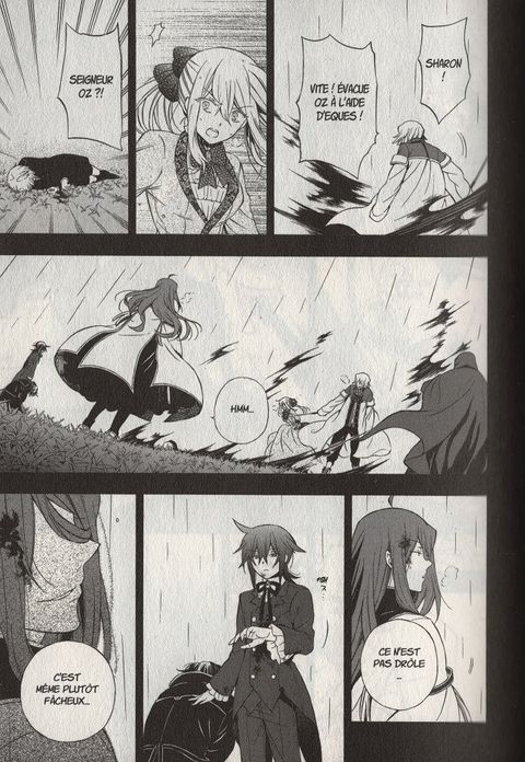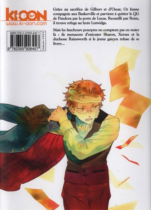 Au QG de Pandora, investi par les Baskerville, tout va de mal en pis. Glen, qui a entie`rement pris possession de Leo, sort le jeune Vessalius de sa prison pour l'exe´cuter en personne. Mais c'est sans compter sur Gilbert : a` pre´sent que tous ses souvenirs lui sont revenus, l'ancien valet sait comment s'affranchir du male´fice qui le lie a` son mai^tre de jadis... Il n'he´site pas a` sacrifier son bras gauche pour sauver Oz ! Voyant leur proie leur e´chapper, les faucheurs pourpres lancent une gigantesque chasse a` l'homme...