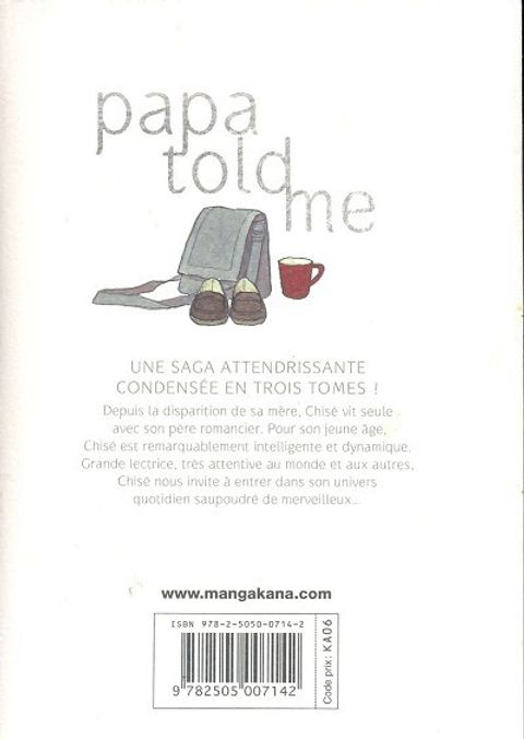Une saga attendrissante condensée en trois tomes ! Depuis la disparition de sa mère, Chisé vit seule avec son père romancier. Pour son jeune âge, Chisé est remarquablement intelligente et dynamique. Grande lectrice, très attentive au monde et aux autres, Chisé nous invite à entrer dans son univers quotidien saupoudré de merveilleux...