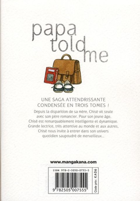 Une saga attendrissante condensée en trois tomes ! Depuis la disparition de sa mère, Chisé vit seule avec son père romancier. Pour son jeune âge, Chisé est remarquablement intelligente et dynamique. Grande lectrice, très attentive au monde et aux autres, Chisé nous invite à entrer dans son univers quotidien saupoudré de merveilleux.