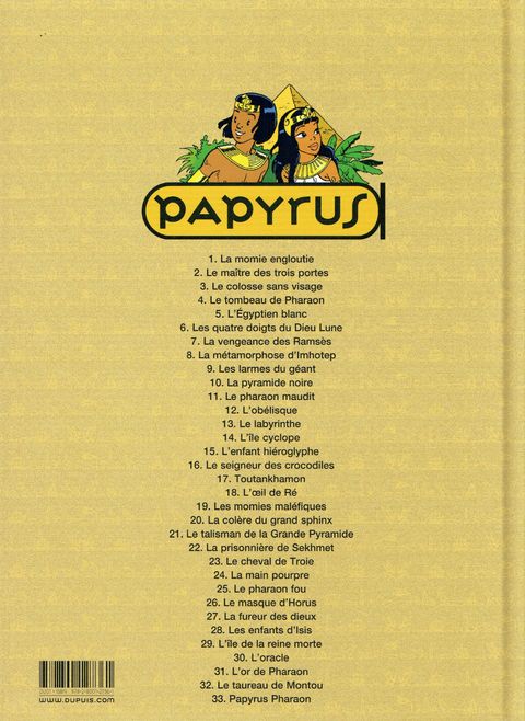 Jeune fellah vivant dans l'Egypte ancienne, Papyrus acquiert un glaive magique et sauve la princesse Théti-Chéri, dont il devient le protecteur et le confident. Il aura fort à faire pour protéger son amie des complots et des manoeuvres ourdis par les prêtres d'Amon ou les princes fourbes acharnés à la perdre. Papyrus est à présent le héros d'une grande série (52 épisodes !) de dessin animé diffusée avec grand succès dans toute l'Europe.