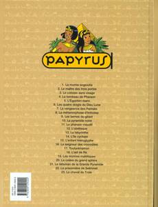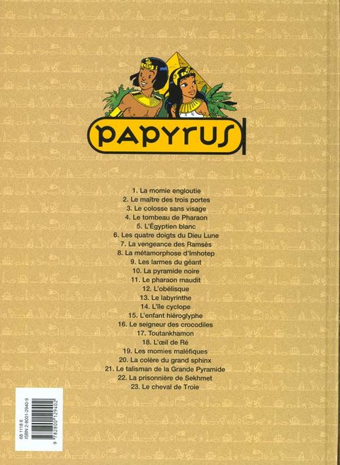 Sur les traces d'UlysseCapturés par des pirates phéniciens, Papyrus et Théti devaient être vendus comme esclaves avant qu'une tempête fantastique les arrache des mains de leurs ravisseurs pour les rejeter sur les côtes de la ville de Troie. Mais depuis la guerre, qui a duré dix ans, la ville n'est plus que ruines et désolation. Des bandes de pillards y font régner la terreur, à la recherche du trésor du roi Priam. Pour sauver sa princesse et libérer cette cité, Papyrus va devoir redoubler d'astuces pour échapper aux griffes de la belle Hélène et au courroux de son prétendant, le jaloux Brutorus.Visitez le bassin méditerranéen au temps des ÉgyptiensAprès son retour triomphal à la télévision et la conquête d'un plus large public, Papyrus vit de nouvelles aventures en bandes dessinées. Embarquez avec Papyrus et De Gieter dans une grande saga. Pour la première fois, notre égyptologue préféré nous entraîne dans une fresque en trois parties qui permettra de découvrir le bassin méditerranéen au temps des Égyptiens. Une façon intelligente et imaginative de mêler la Fantasy à l'histoire et d'entraîner les jeunes lecteurs au-delà de leur imagination.
