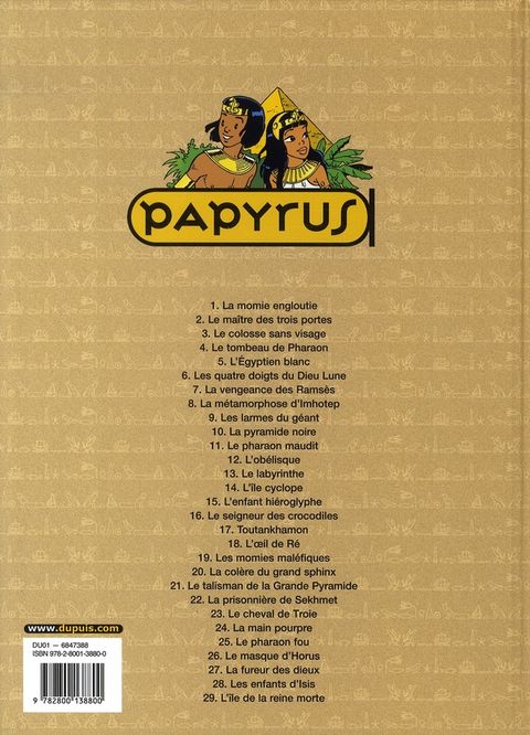Maintenant que leur idylle est reconnue et approuvée par Pharaon, Papyrus et Théti-Chéri coulent des jours heureux à Thèbes. Mais ce répit est, hélas, de courte durée... Pharaon écarte, en effet, très rapidement le jeune couple de la ville car il craint des représailles de la part de Seth et veut, de la sorte, les protéger. Mais ne courent-ils pas plus de dangers, envoyés loin de chez eux oe Découvrez sans plus tarder cette nouvelle aventure où, contre vents et marées, nos deux héros vont devoir vaincre la vengeance de Seth, combattre toutes sortes d'animaux fantastiques et dépasser, une fois de plus, leurs peurs. À chaque nouvel épisode de Papyrus, Lucien de Gieter nous en dévoile toujours un peu plus sur l'Egypte ancienne et ses mystères. Sur fond historique, l'auteur parvient à greffer une série d'aventures où l'amour, les complots et le pouvoir se partagent la première place. Résolument positifs, les récits de Lucien de Gieter font la part belle à l'amour. Celui de Papyrus et de Théti-Chéri, qui devront déjouer, une nouvelle fois, les mauvais tours divins dans une ambiance qui s'annonce, pour le moins, fantastique.