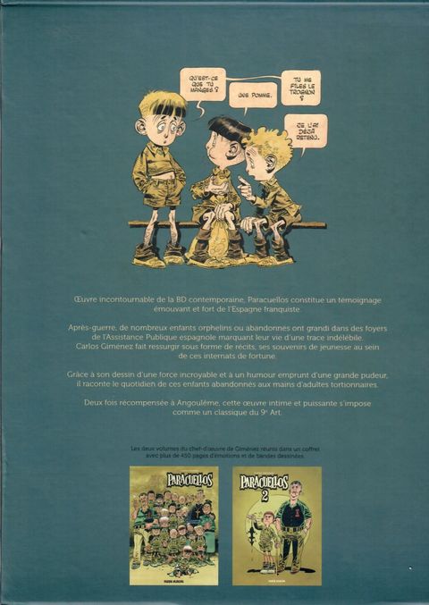 Les deux volumes du chef-d'oeuvre de Giménez réunis dans un coffret avec plus de 450 pages d'émotions et de bandes dessinées. Avec un dessin d'une extraordinaire sensibilité, Carlos Giménez raconte ses souvenirs d'enfance dans les Foyers de l'Assistance Publique espagnole, sous le règne d'un certain Franco. Malgré le caractère parfois insoutenable de certaines anecdotes, Giménez colore ses souvenirs d'un humour emprunt d'une grande pudeur, qui fait penser à Chaplin. Ce recueil constitue le plus émouvant plaidoyer pour la disparition des enfances malheureuses du monde entier. Entre le rire et les larmes, à lire avec un mouchoir à portée de la main.