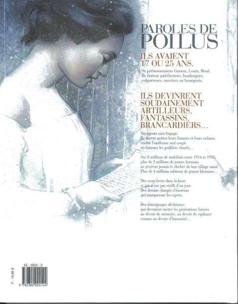Ils avaient 17 à 25 ans. Se prénommaient Gaston, Louis, René. Ils étaient palefreniers, boulangers, colporteurs ou bourgeois. Ils devinrent soudainement artilleurs, fantassins, brancardiers... Voyageurs sans bagages, ils durent quitter leur femme et leurs enfants, revêtir l'uniforme mal coupé et chausser les godillots cloutés. Sur 8 millions de mobilisés entre 1914 et 1918, plus de 2 millions de jeunes hommes ne revirent jamais le clocher de leur village natal. Plus de 4 millions subirent de graves blessures. Cet ouvrage exceptionnel regroupe des adaptations en BD de véritables lettres de Poilus par Guarnido, Bajram, De Metter, Lepage, Lidwine, Parnotte, Mallié, Juan Gimenez et bien d'autres. Des mots écrits dans la boue et qui n'ont pas vieilli d'un jour. Des dessins chargés d'émotion qui marqueront les esprits.