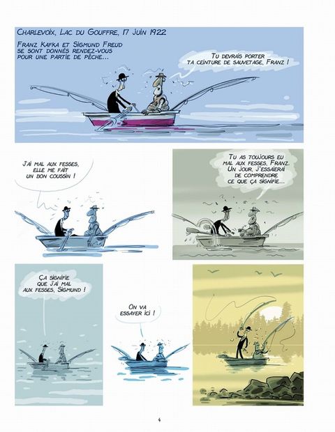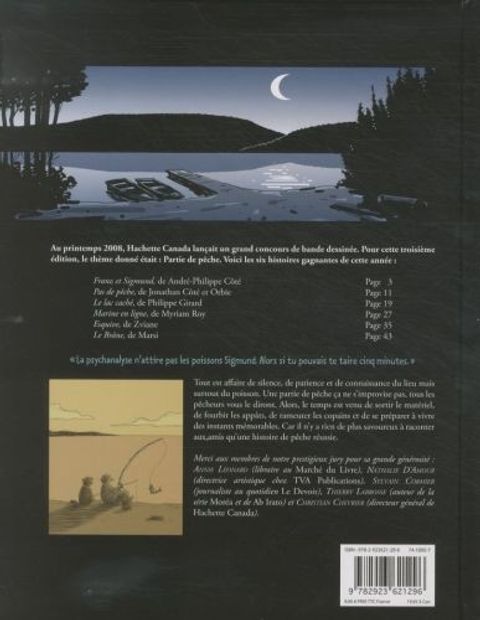 « La psychanalyse n´attire pas les poissons Sigmund. Alors si tu pouvais te taire cinq minutes.» Au printemps 2008, Hachette Canada lançait un grand concours de bande dessinée. Pour cette troisième édition, le thème donné était : Partie de pêche. Voici les six histoires gagnantes de cette année. Tout est affaire de silence, de patience et de connaissance du lieu mais surtout du poisson. Une partie de pêche, ça ne s'improvise pas, tous les pêcheurs vous le diront. Alors le temps est venu de sortir le matériel, de fourbir les appâts, de rameuter les copains et de se préparer à vivre des instants mémorables. Car il n'y a rien de plus savoureux à raconter aux amis qu'une histoire de pêche réussie.