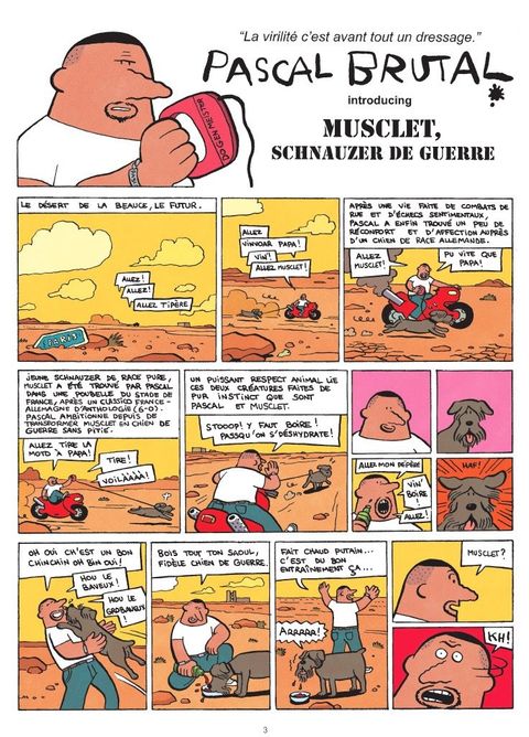 A mi-chemin entre la vision fantasmée de la caillera de banlieue et le justicier des temps modernes, Pascal Brutal est fort, violent, oisif et séduisant. Pilotant sa grosse moto rouge sans casque, fumant joint sur joint, cassant la gueule de quiconque se met en travers de son chemin, faisant l'amour à toutes les femmes qu'il croise, il représente la nouvelle virilité. Décomplexé, animal, sûr de lui, irrésistible, Pascal Brutal est le français parfait du futur.