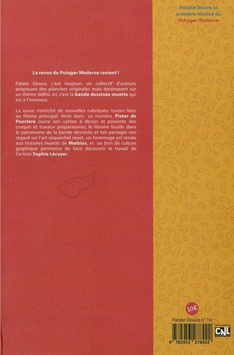 Patate Douce, c'est toujours un collectif d'auteurs proposant des planches originales mais dorénavant sur un thème défini. Ici, c'est la bande dessinée muette qui est à l'honneur. La revue s'enrichit de nouvelles rubriques, toutes liées au thème principal. Ainsi dans ce numéro, Pieter de Poortere ouvre son carton à dessin et présente des croquis et travaux préparatoires, le libraire fouille dans le patrimoine de la bande dessinée et fait partager son regard sur l'art séquentiel muet, un hommage est rendu aux histoires muettes de Moebius, et un brin de culture graphique permettra de faire découvrir le travail de l'artiste Sophie Lécuyer.