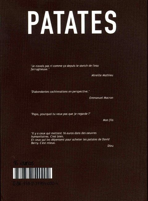 On pense souvent que les patates ne ressentent pas les émotions. On a tort. Les ignobles Patates de David Berry mènent des vies tragiques et dépravées sous des apparences lisses et joyeuses. De l'humour très sale qui a l'air super propre.
