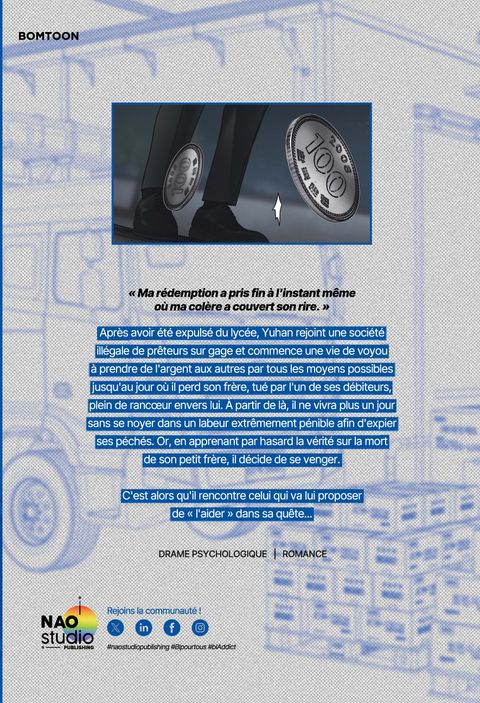 « Ma rédemption a pris fin à l'instant même où ma colère a couvert son rire. » Yuhan fait parti d'un réseau illégal de prêteurs sur gage et commence une vie de voyou à collecter les dettes pour un gang, jusqu'au jour où il perd son frère. À partir de là, il ne vivra plus un jour sans se noyer dans un labeur extrêmement pénible afin d'expier ses péchés. Or, en apprenant par hasard la vérité sur la mort de son petit frère, il décide de se venger. C'est alors qu'il rencontre celui qui va lui proposer de « l'aider » dans sa quête... Édition unique avec Photocard incluse pour la première édition.
