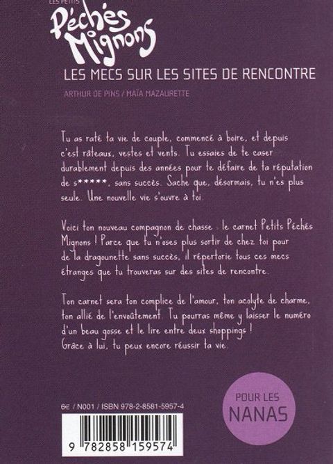 Tu as raté ta vie de couple, commencé à boire, et depuis c'est râteaux, vestes et vents. Tu essaies de te caser durablement depuis des années pour te défaire de ta réputation de s..., sans succès. Sache que, désormais, tu n'es plus seule. Une nouvelle vie s'ouvre à toi. Voici ton nouveau compagnon de chasse : le carnet Petits Péchés Mignons ! parce que tu n'oses plus sortir de chez toi pour de la dragounette sans succès, il répertorie tous ces mecs étranges que tu trouveras sur des sites de rencontre. Ton carnet sera complice de l'amour, ton acolyte de charme, ton allié de l'envoûtement. Tu pourras même y laisser le numéro d'un beau gosse et le lire entre deux shoppings ! Grâce à lui, tu peux encore réussir ta vie.