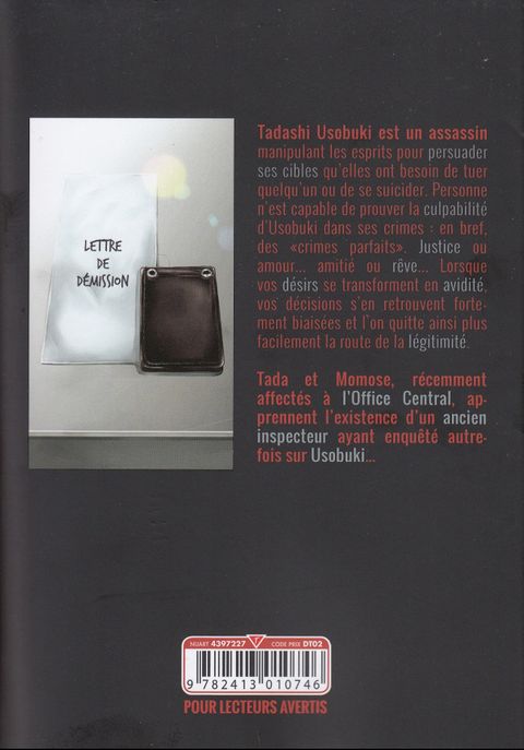 Un homme, Tadashi Usobuki, est repéré à plusieurs reprises sur le lieu de crimes étranges. Toutefois, personne n'arrive à prouver sa culpabilité. Depuis, tout le monde l'appelle " l'homme aux crimes parfaits ". Haine... Jalousie... Désir... et amour. Usobuki est capable de répondre à toutes les demandes de meurtre de ses clients. Et méfiez-vous, il ne rôde jamais très loin de vous...
