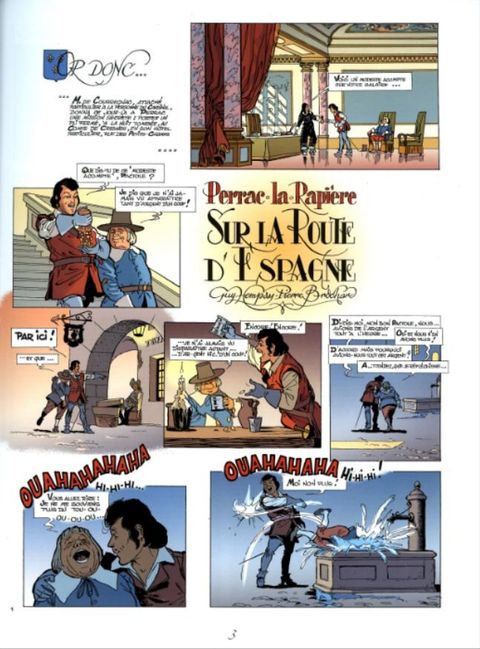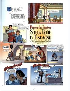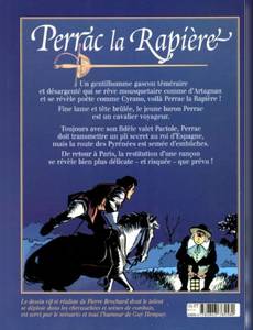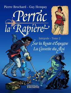 Contient deux aventures : Sur la Route d'Espagne, La Cassette du Roi. Un gentilhomme gascon téméraire et désargenté qui se rêve mousquetaire comme d'Artagnan et se révèle poète comme Cyrano, voilà Perrac-la-Rapière ! Ce « cousin » du chevalier de Saint-Clair part à l'aventure dans le contexte historique du début du XVIIe s. marqué par les luttes entre la noblesse française et le pouvoir royal du duo Louis XIII-Richelieu. Fine lame et tête brûlée, le jeune baron Perrac est un cavalier voyageur. Dans les deux épisodes de cet album, il nous emmène, avec son fidèle valet Pactole, sur les routes du royaume d'Espagne. Les embuscades, les joutes verbales, les Grands, la cour et l'étiquette donnent à ces épisodes un petit air de La Folie des grandeurs. Et l'on voit Perrac manquer de devenir mousquetaire! C'est la suite aux Editions du Triomphe d'un inédit de Pierre Brochard ! Cette magnifique édition de Perrac-la-Rapière sort de l'oubli un héros de cape et d'épée dont les exploits étaient paru