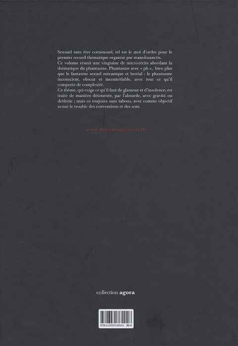 Sensuel sans être consensuel, tel est le mot d'ordre pour le premier recueil thématique organisé par manolosanctis. Il s'agira de réunir sur un volume à la finition exceptionnelle une vingtaine de micro-récits abordant la thématique du phantasme. Phantasme avec « ph », pas uniquement le fantasme sexuel mécanique et bestial, mais le phantasme inconscient, obscur et incontrôlable, avec tout ce qu'il comporte de complexité. Ce thème, qui exige ce qu'il faut de glamour et d'insolence, pourra être traité d'une manière détournée, par l'absurde, avec gravité ou drôlerie ; mais ce toujours sans tabous, avec comme objectif avoué le trouble des conventions et des sens.