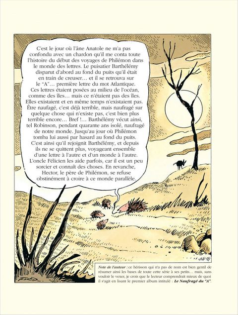 Le jeune Philémon vit à la campagne et passe son temps à rêver en compagnie de son âne Anatole. Au cours d'une promenade, il rencontre Barthélémy le puisatier qui est à la recherche de son paradis perdu : la lettre A du mot Atlantique. Grâce au vieux Félicien qui sait comment se rendre là-bas, ils partent régulièrement pour ce monde parallèle. Malheureusement les manoeuvres sont parfois approximatives et ils se retrouvent dans d'autres lettres peuplées de curieux personnages. Cet univers farfelu et merveilleux est imaginé par Fred pour PILOTE en 1965. Son trait imaginatif et nouveau, ses mises en page particulières, ses planches grouillantes de détails insolites, de clins d'oeil, de malices et de trouvailles graphiques ne laissent pas indifférent.
