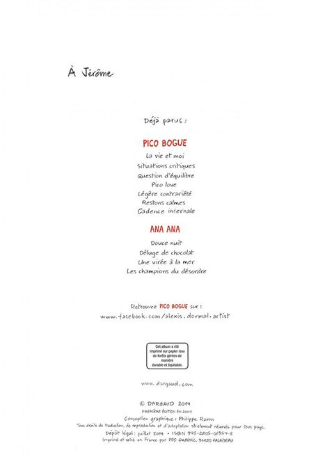 Pico Bogue poursuit son exploration au petit bonheur la chance des grandes questions sur la vie et absolument tout le reste ! Ana Ana, sa petite soeur, met un point d'honneur à l'aider ou le contrarier selon les circonstances, ses parents passent du rire aux larmes, et les amis des parents apprennent à découvrir le charmant petit monstre. Une galerie de personnages, des histoires et des situations absolument irrésistibles !