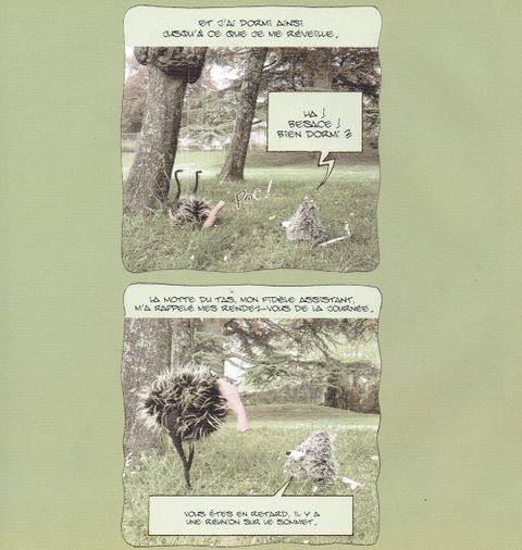 Tout va pour le mieux dans le meilleur des parcs, enfin surtout pour Besace qui continue d'exploiter inlassablement La Mote du Tas. Mais catastrophe ! Besace se prend un pigeon dans le nez ! Et il n'arrive pas à en sortir, et ses plumes chatouillent Besace. Quel calvaire ! Heureusement la boîte qui parle et le garage du coin sauront les tirer d'affaire...