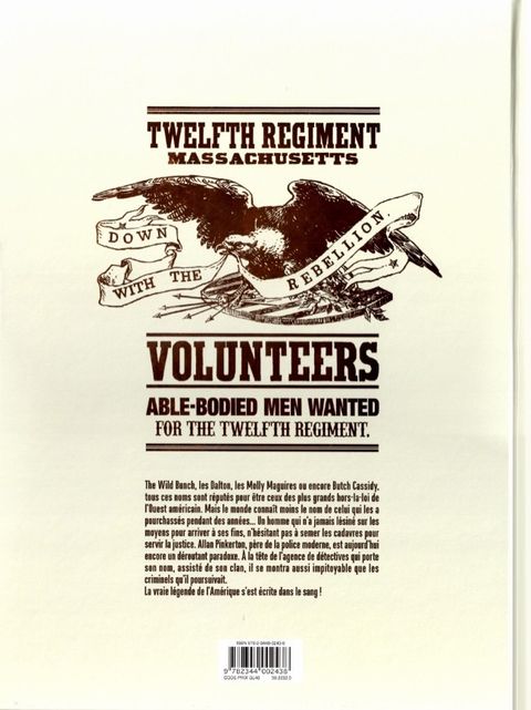 Mai 1862, Virginie. Voilà plus d'un an que la guerre de Sécession fait rage aux États-Unis. Allan Pinkerton est à présent le chef des services de renseignement de l'armée de l'Union et de la sécurité rapprochée du président Abraham Lincoln. Envoyé en mission dans un camp confédéré, l'un de ses espions lui rapporte ce qui pourrait bien être la clé de la victoire finale : Un plan de bataille, écrit par la main du général Lee en personne ! Ce nouveau tome des aventures de Pinkerton nous plonge cette fois au coeur de la guerre de Sécession, mettant en lumière les circonstances de la plus sanglante bataille de la guerre civile américaine : le massacre d'Antietam, au cours duquel 23 000 hommes perdront la vie en une seule journée.