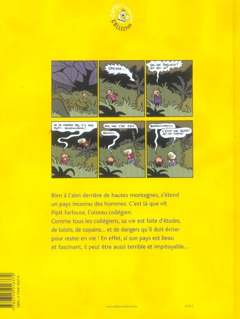 bien à l'abri derrière de hautes montagnes, s'étend un pays inconnu des hommes. c'est là que vit pipit farlouse, l'oiseau collégien. comme tous les collégiens, sa vie est faite d'études, de loisirs, de copains. et de dangers qu'il doit éviter pour rester en vie ! en effet, si son pays est beau et fascinant, il peut être aussi terrible et impitoyable.