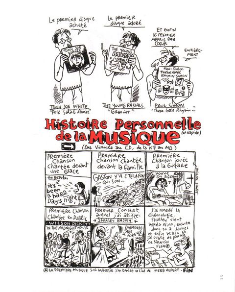 "" toute cette musique entassée, le vacarme que ça ferait si tous les disques se mettaient à libérer leurs sons en même temps. "" dressée et commentée par un auteur de bandes dessinées qui a passé de très longues journées à croquer des centaines de portraits de popstars et de musiciens en écoutant des milliers d'heures de musique, voici une authentique playlist avouée sans petit mensonge.