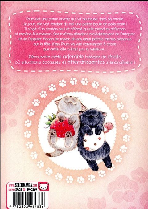 Plum est une petite chatte qui vit heureuse dans sa famille. Un jour qu'elle se baladait dans le jardin, elle découvre une petite boule de poils noire ! Il s'agit d'un chaton seul et affamé qu'elle prend en affection et décide de ramener à la maison. Ses maîtres décident immédiatement de l'adopter et de l'appeler Flocon en raison de ses deux petites taches blanches sur la tête. Mais Plum a vite l'impression que ramener Flocon n'était pas la meilleure idée de sa vie...