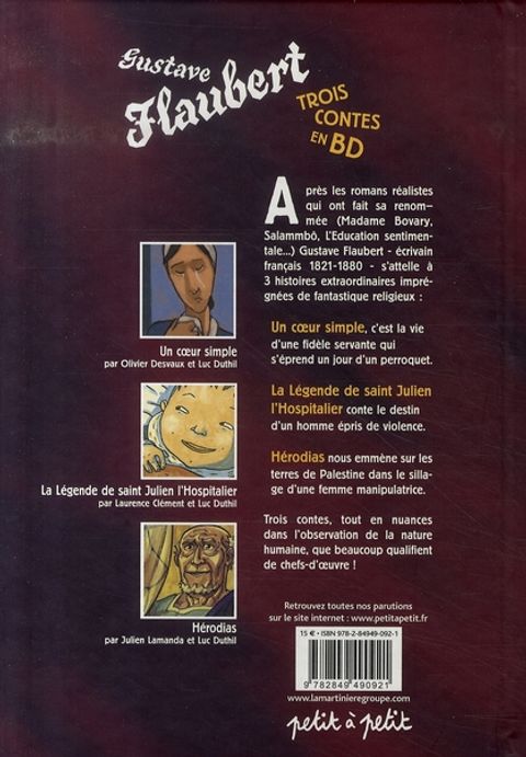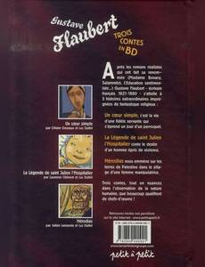 Trois contes est en fait un livre de Gustave Flaubert publié en 1877. L'opuscule comprenait alors : - Un coeur simple fut composé en 1876, - Saint-Julien l'hospitalier fin 1875-début 1876, - Hérodias en 1877. L'écriture des Trois contes prit à Flaubert seize à dix-sept mois de sa vie. Au début pourtant, il douta de sa capacité à pouvoir encore écrire une ligne, mais il finit par enchaîner sans reprendre son souffle l'écriture des contes, raturant sans cesse, travaillant dix-huit heures par jour ; ce fut un labeur épuisant, un travail forcené. Trois contes fut publié la même année que L'Assommoir de Zola, et le recueil rencontra un certain succès. Ces trois contes, de 30 pages chacun, sont adaptés en bandes dessinées par trois jeunes dessinateurs.
