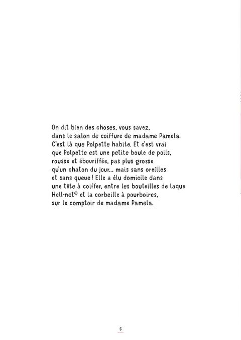 La star de cet album ? Une petite boule de poils qui prend en main son destin, rien de moins. On dit de Polpette que c'est le chat le plus minuscule du monde. On dit aussi qu'elle ressemble à une mandarine velue. On dit bien des choses, dans le salon de coiffure de Madame Pamela. C'est là que Polpette a élu domicile, entre les bigoudis et les bouteilles de laque : l’odeur de la laque, elle en est zinzin ! Tout le monde adore Polpette car depuis son arrivée, plus aucun malheur ne se produit au paisible village de Portus Apua. Mais un jour, Polpette prend la poudre d’escampette et part à la rencontre de son destin. Qui pourrait prévoir qu’une si petite boule de poils détient en fait un si grand pouvoir et… de si grandes responsabilités ?